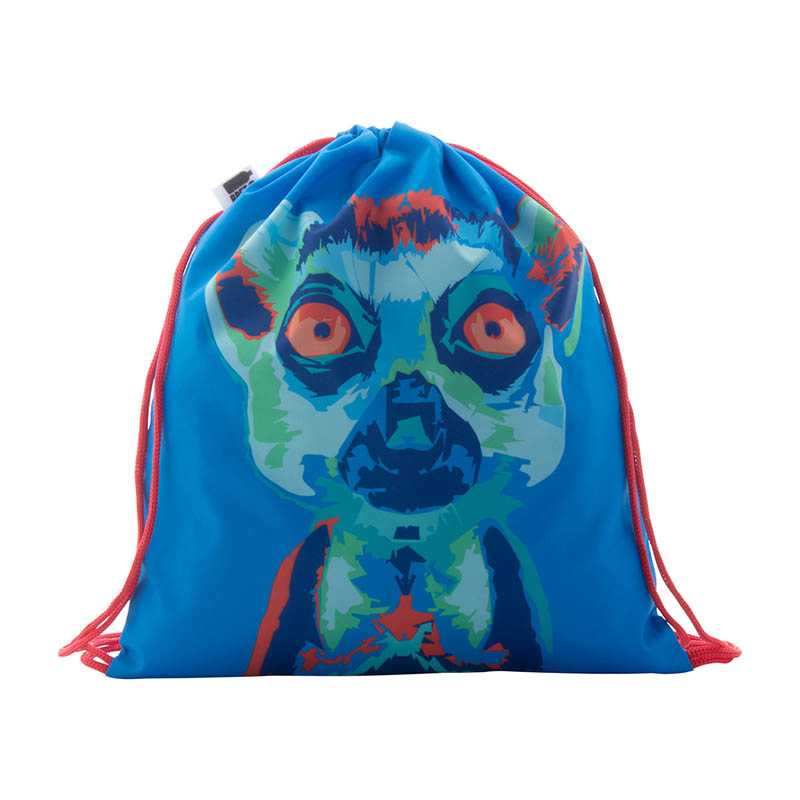 Taška pre deti s farebnými šnúrkami vyrobená na zákazku, polyester 190T RPET, výrazný štítok RPET. S celoplošnou sublimačnou potlačou. Min. mn.: 50 ks.