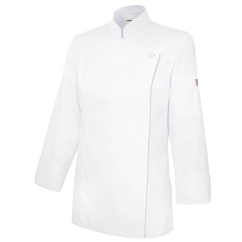 Covered asymmetrical front zip with button Mao collar Tailored sleeves with opening at cuffs Without side seam One pocket: 1 patch pocket on left sleeve
