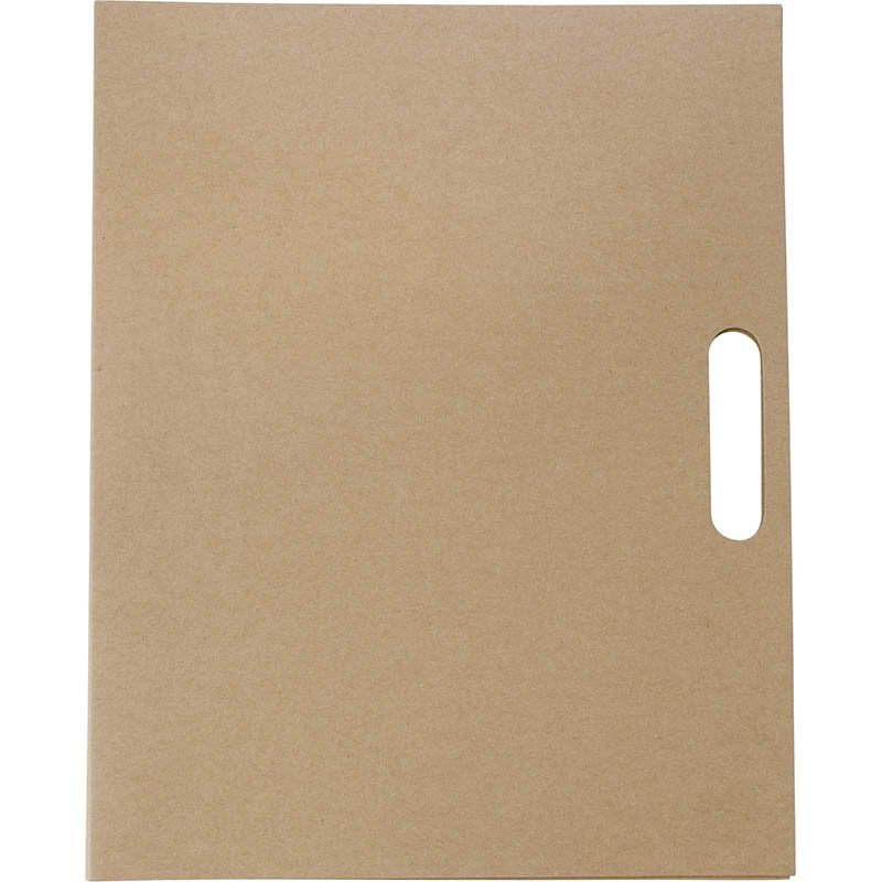 Cardboad folder with an notepad with 25 lined pages, multiple colours of stikcy notes (25 sheets per colour), and a pen loop with cardboard ballpen, blue ink.