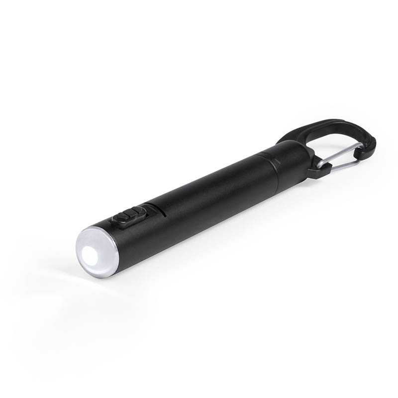 NOVINKA 2025. Ball pen with built-in LED flashlight. In an original design, with body in smooth metallic finish in varied colors and hood with carabiner. In blue ink with button cell batteries included.