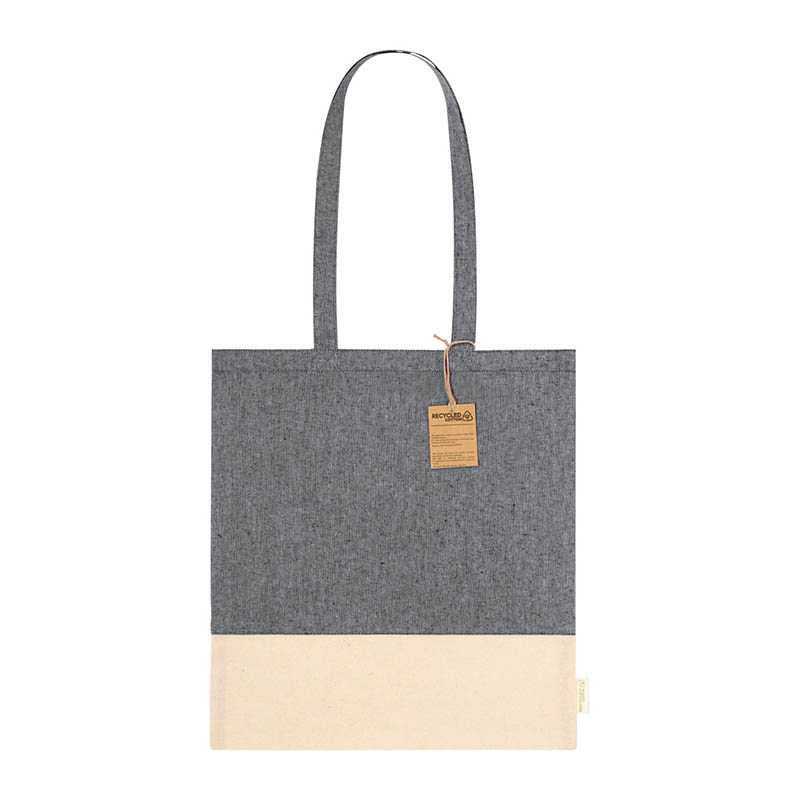 Dvojfarebná nákupná taška z recyklovanej bavlny s dlhými ušami a výrazným štítkom z recyklovanej bavlny. 100% recyklovaná bavlna, 120 g/m2.