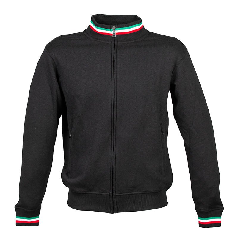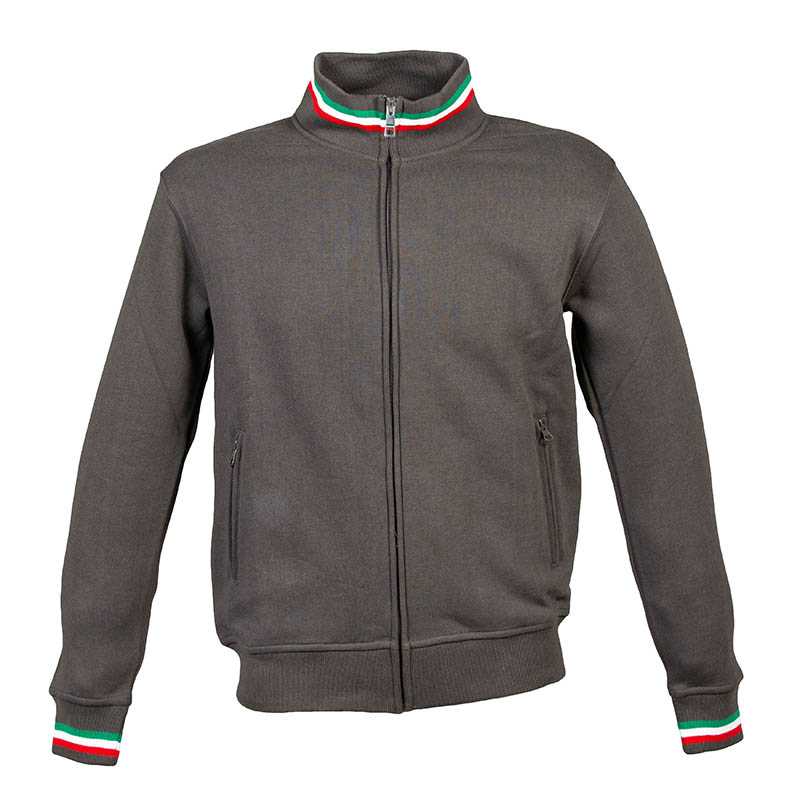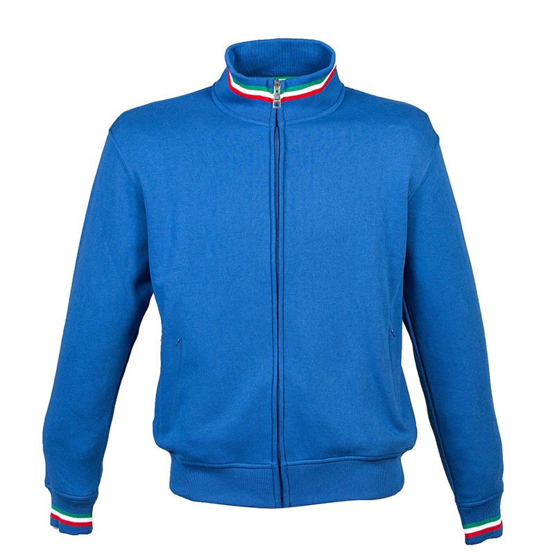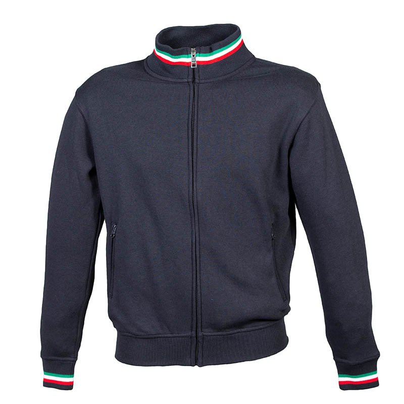 80% Cotton - 20% polyester sweater - Ribbed collar with italian color - Full zip covered - Puller with italian colors - Two pockets with zipper-covered - Ribbed cuffs - Ribbed collar, cuffs and band at the waist 8 cm h - Tape inside collar - Stitching