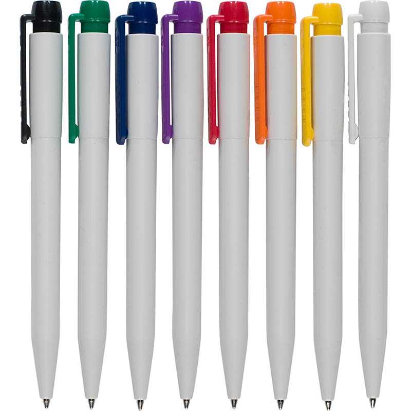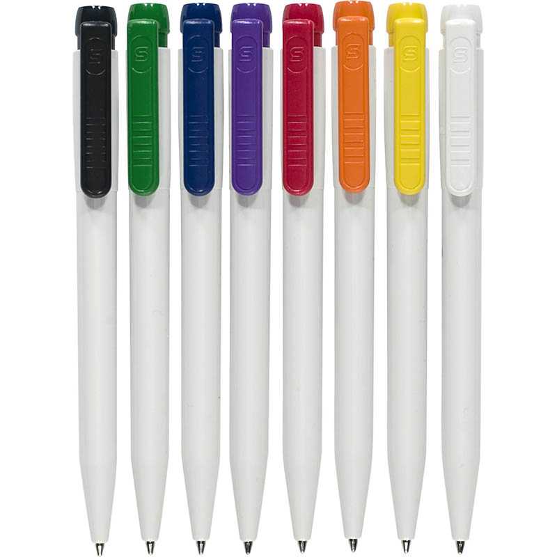 Stilolinea plastic ballpen with a white barrel, coloured wide clip, and jumbo refill. Blue ink. Provided with German Dokumental Ink.