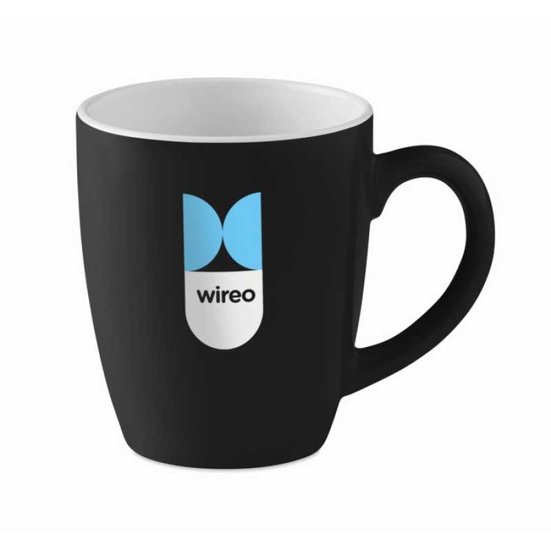 Contemporary quality ceramic mug. In all white or with a coloured exterior. Dishwasher safe. Capacity 310 ml. The imprint is dishwasher tested and certified: EN 12875-2.