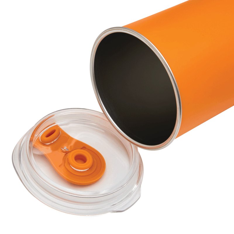 Stainless steel thermos cup (300 ml), double walled. The outer wall is stainless steel, the inner wall is plastic. The screw-on lid is leakproof and has a drinking opening with cap. The bottom of the cup is anti-slip. We do not recommend laser engraving o