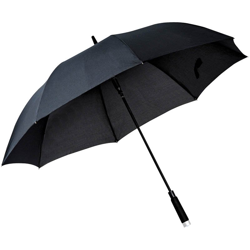 Umbrella with 190T pongee nylon canopy, storm proof design, automatic telescopic opening, fibreglass frame and shaft, soft foam handle and velcro fastener. In a pouch.