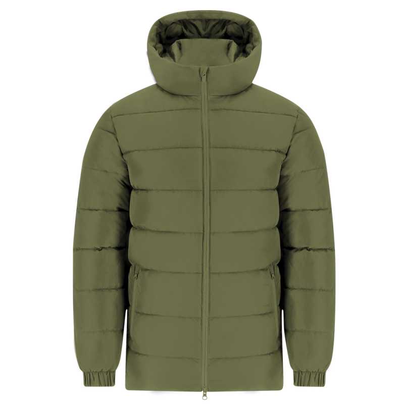 NOVINKA 2025 XMASS. Unisex padded parka with adjustable fixed hood. Features black front zip with chin guard for added comfort and protection, two side pockets with black zip closure, and adjustable cuffs with Velcro.