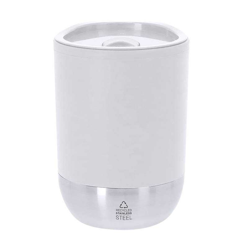 NOVINKA 2025. Insulated Cup with a capacity of 290 ml. Made of strong, double wall Recycled PP, in combination with a Recycled Stainless Steel base. Eady opening lid with dispenser, BPA free. It is ideal for your desk, table, or any surface where you can enjoy your favorite drink. Food Grade certified, guaranteeing safety when food comes into contact with the material used to manufacture the product. With Recycled Stainless Steel logo. Recycled PP is a recycled and highly recyclable plastic, highly resistant and suitable for a multitude of applications.Steel is one of the most sought-after materials and can be found almost everywhere, from everyday products to large buildings. It has countless properties, including durability and a high degree of reusability, making it a highly valued alternative for sustainability solutions. Properly treated, it allows new resources of infinite use to be obtained.