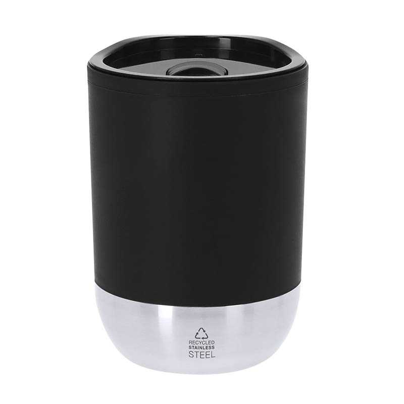 NOVINKA 2025. Insulated Cup with a capacity of 290 ml. Made of strong, double wall Recycled PP, in combination with a Recycled Stainless Steel base. Eady opening lid with dispenser, BPA free. It is ideal for your desk, table, or any surface where you can enjoy your favorite drink. Food Grade certified, guaranteeing safety when food comes into contact with the material used to manufacture the product. With Recycled Stainless Steel logo. Recycled PP is a recycled and highly recyclable plastic, highly resistant and suitable for a multitude of applications.Steel is one of the most sought-after materials and can be found almost everywhere, from everyday products to large buildings. It has countless properties, including durability and a high degree of reusability, making it a highly valued alternative for sustainability solutions. Properly treated, it allows new resources of infinite use to be obtained.