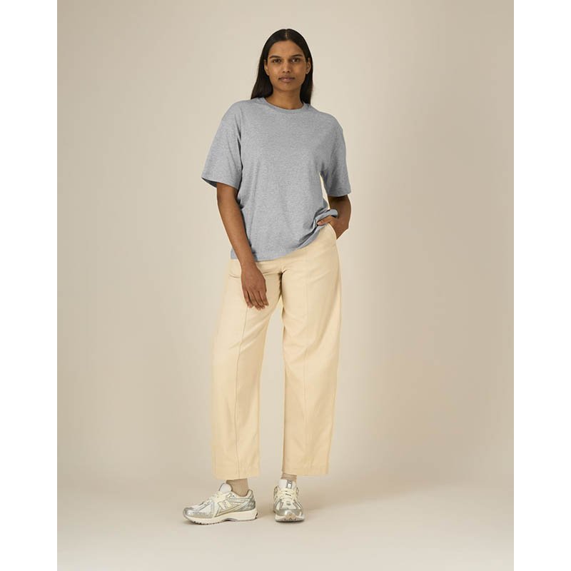 Volný střih. Větší výstřih s nezačištěným okrajem límce ze stejné látky. Zpevňovací páska od ramene k rameni. Dvakrát předsrážené. 100 % česaná kruhově dopřádaná bavlna