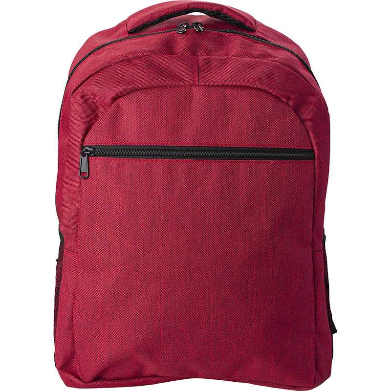 Polyester (600D) backpack with zipper front pocket, and adjustable shoulder straps. Inside pocket for laptop up to 15 inches. Mesh pocket on 2 sides.