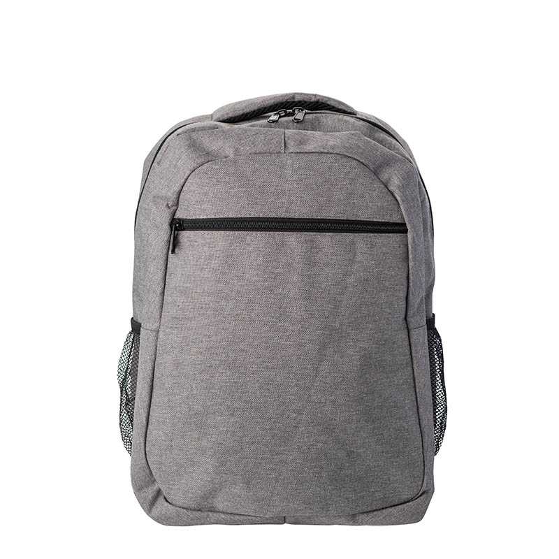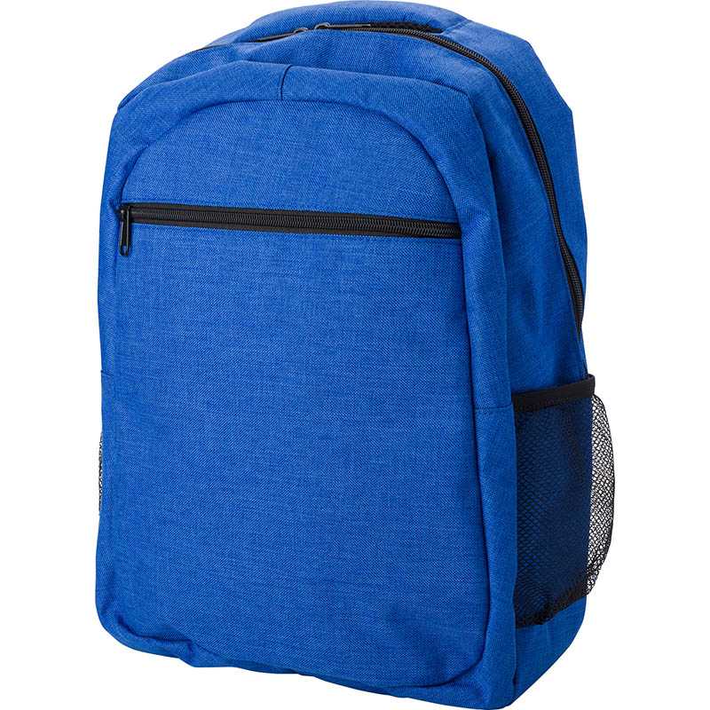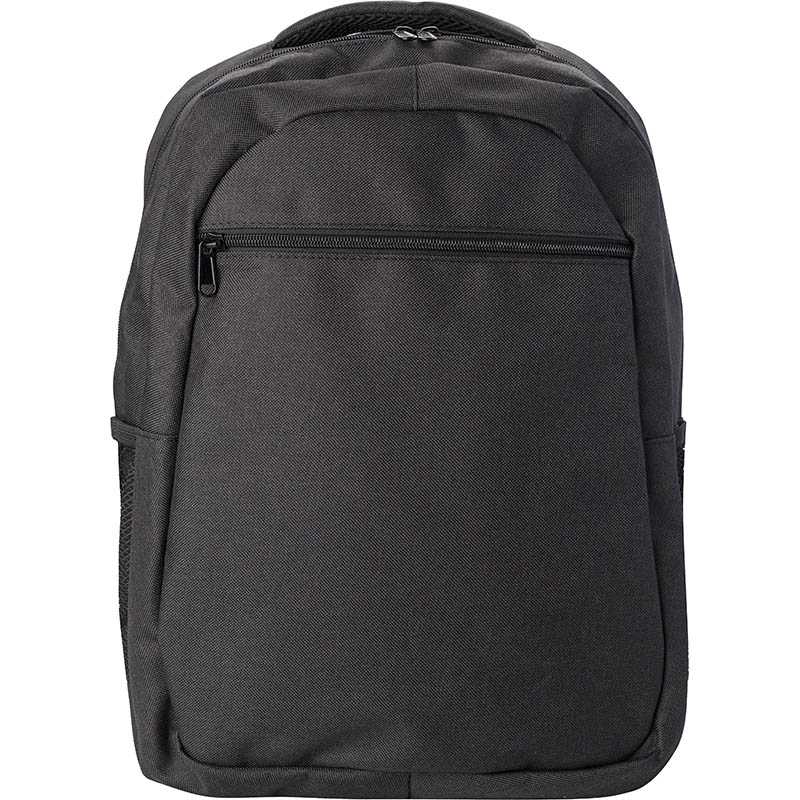 Polyester (600D) backpack with zipper front pocket, and adjustable shoulder straps. Inside pocket for laptop up to 15 inches. Mesh pocket on 2 sides.
