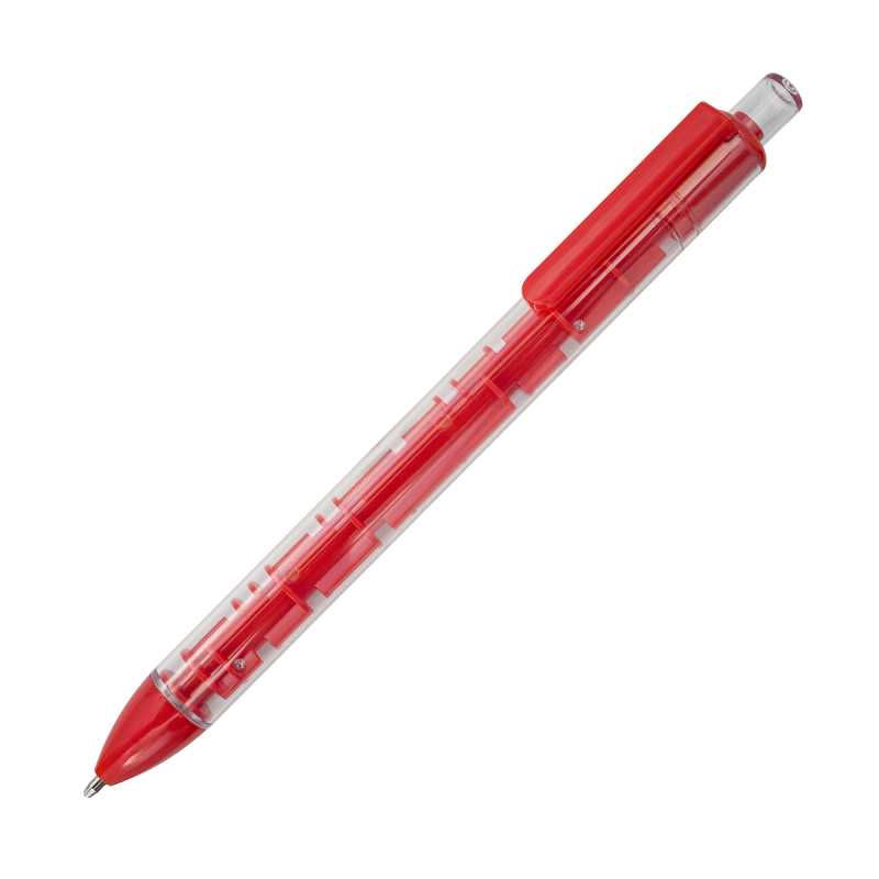 Guľôčkové pero z plastu s priehľadným telom a vstavaným bludiskom. Modrá náplň.