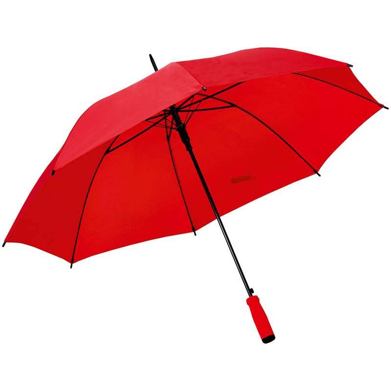 Umbrella with automatic telescopic springs. 190T polyester canopy, fibreglass frame, metal stem, soft foam handle and velcro closure.