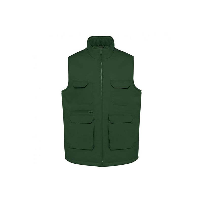 Two-Tone Padded Multi-Pocket Work Vest. Made of a sturdy cotton twill fabric blended with polyester outer fabric for strength and durability, smooth inner lining and inner quilting for ensuring excellent thermal insulation. Stand-up collar with full-zip flap and snap matching button front closure, which provides warmth and comfort. Elasticated waistband and armholes for a secure and comfortable fit, adjustable waist with side button fastening for a better fit, a tailpiece that covers the lumbar zone for added comfort and also provides a large printing area.Two lower gusseted pockets, two side pockets, two upper pockets (with a zip on the left for easy customization), three pen holders, a small accessory pocket and an inner velcro pocket, for a secure and convenient storage. Includes an inside back zip for easy marking with different methods: screen printing, embroidery, transfer printing, badges, shields, vinyl application. Ideal as workwear and uniforms, this Vest matches all THUNDER line items (sweatshirt, trousers, T-shirt, polo shirts, fleece jacket, and softshell jacket).