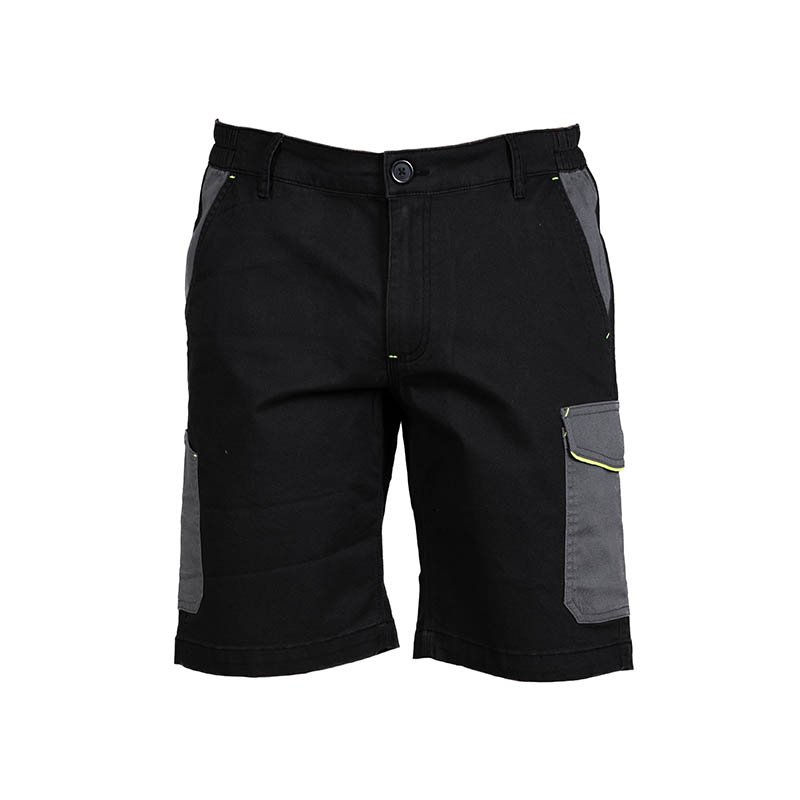 SHORT PANT IN STRETCH FABRIC HORIZONTALLY AND VERTICALLY 4 STRETCH - 90% nylon – 10% elastane fabric - Triple stitching - Two front pockets - One side pocket with velcro, one small open pocket and a tool loop - A front tool pocket with reflective band - One rear zip pocket with reflective tape - A back pocket for ruler or tool holder, with reflective band - Elastic waist with large loops - Covered snap button at waist