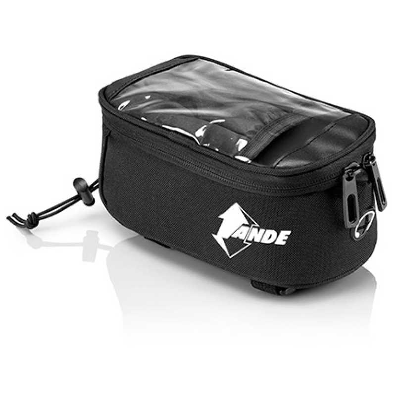 Bike bag with smartphone window ANDE. Packiging: in a paper box. Color black. Material: Polyester 600D with Rubber bottom. Size: 20x11x9 cm.