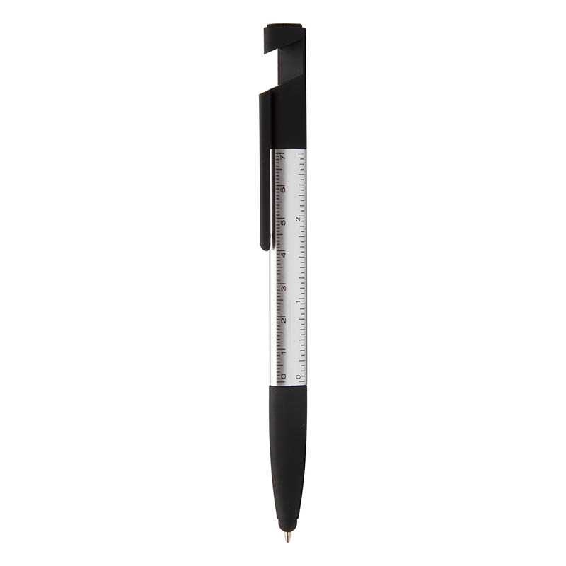 Mutltifunctional ABS ballpen with twist action mechanism. Including: a level, ruler, and rubber tip for capacitive screens. Black ink.