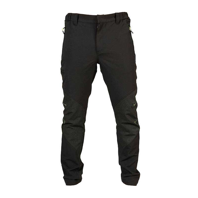Front closure with zip and button Elastic waistband Oxford fabric reinforcements on knees and lower leg Reinforced back fabric Knee-height compartment for knee pads with Velcro closure D