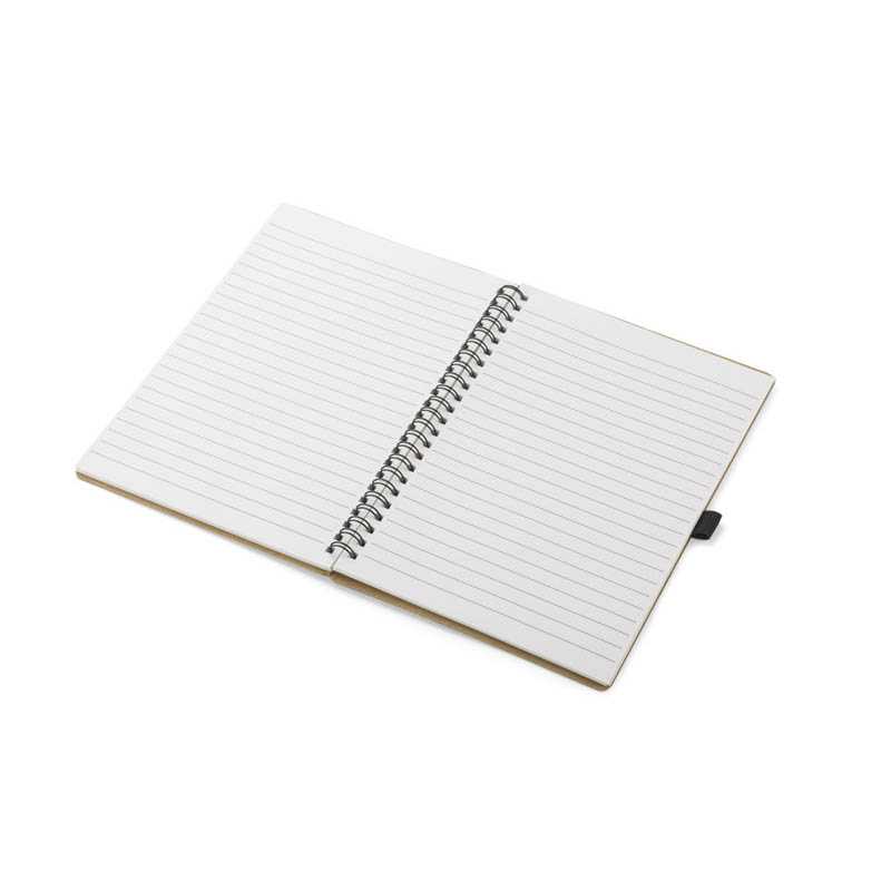 Poznámkový blok o velikosti A5 s obalem z recyklované lepenky, kroužkovou vazbou a očkem pro pero. Obsahuje 70 linkovaných listů kamenného papíru 60 g/m2. Kamenný papír je vyroben 100% bez použití stromů a výrobní proces spotřebovává méně energie ve srovnání s recyklovaným nebo novým papírem z celulózy. Papír je odolný proti vodě a roztržení a má přirozenou bílou barvu (bez nutnosti bělení).