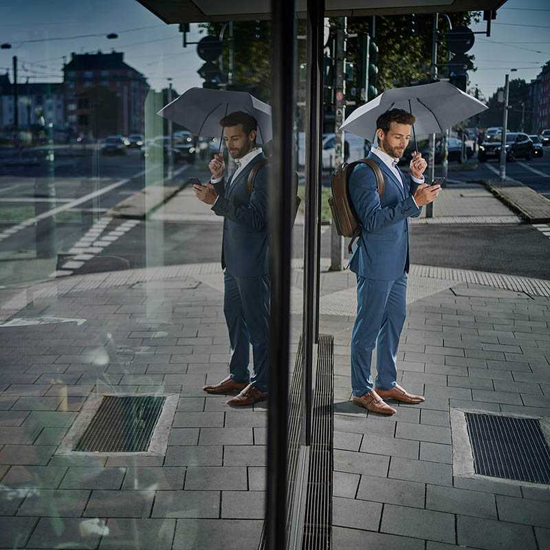 Easy to handle thanks to sliding safety runner, high-quality Windproof PLUS system for maximum frame flexibility in stormy conditions, special umbrella shape through 10 panels, cover with trendy reflective piping in silver, comfortable Soft-Feel handle with elastic loop and promotional labelling option, generous diameter, sleeve with trendy reflective piping.