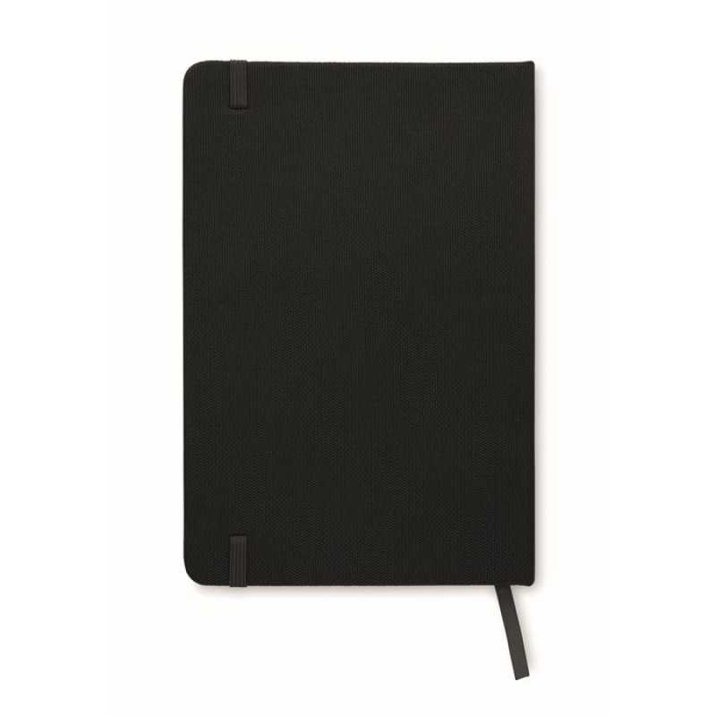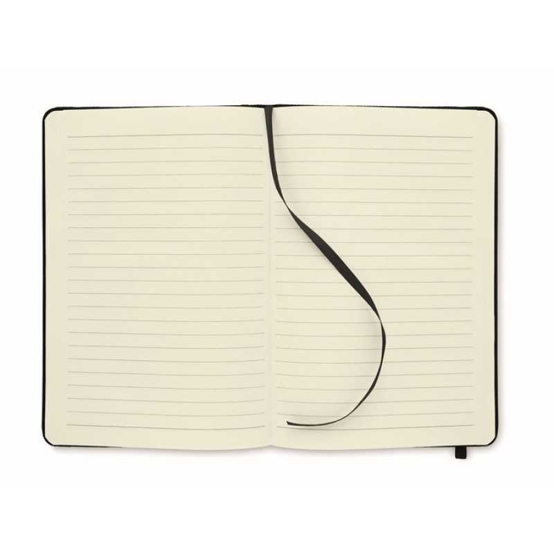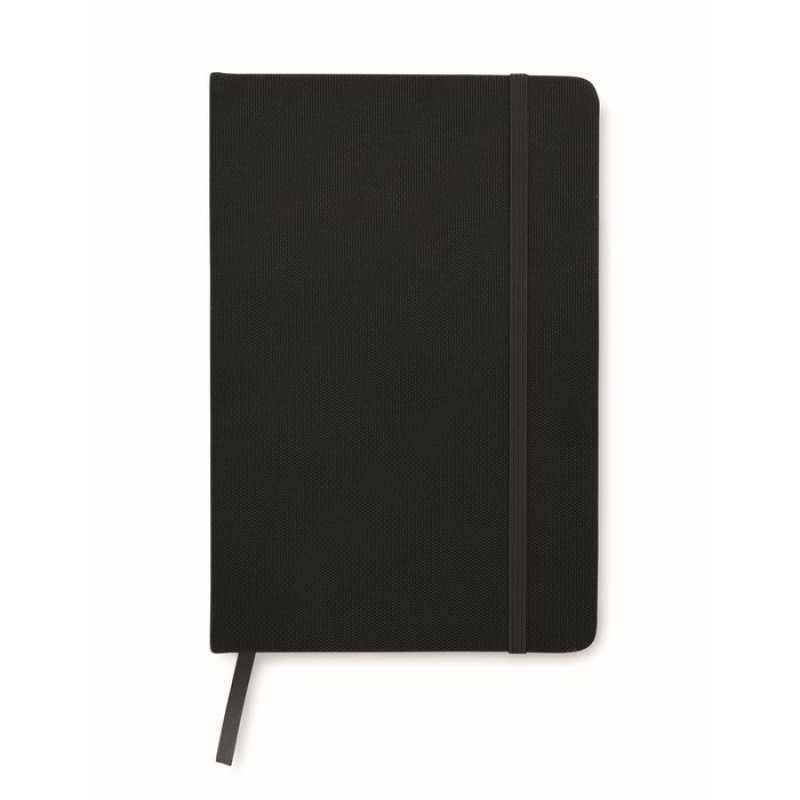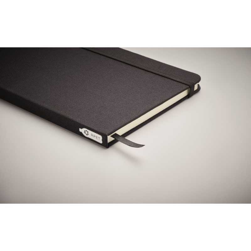Zápisník A5 s tvrdou obálkou z 600D RPETu. 160 linkovaných stránek z recyklovaného papíru (80 listů). Zavírací gumička a a záložka v ladící barvě.
