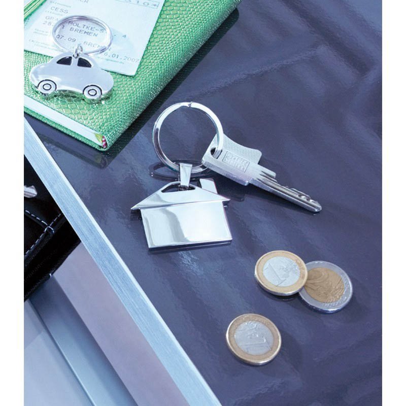 Kovový prívesok na kľúče v tvare domčeka, v čiernej darčekovej krabičke.