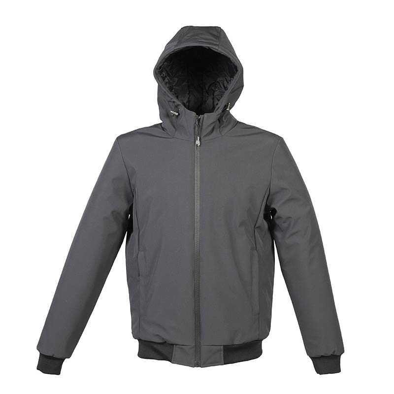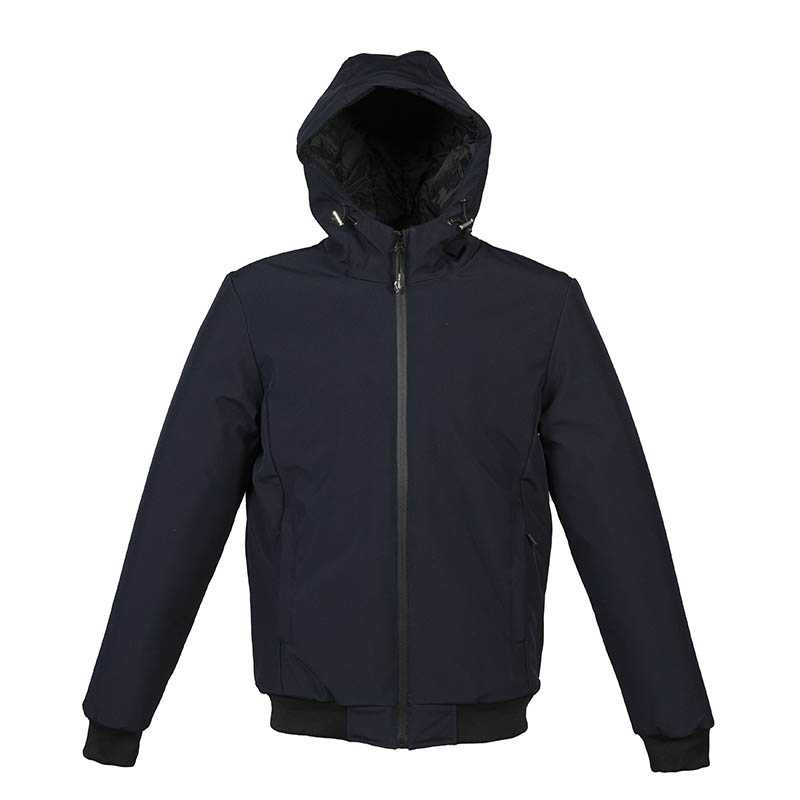Waterproof composite fabric jacket - Shoulders, lower torso, sides and bottom of the sleeve in 3-layer stretch softshell - Chest and back in 92% polyester - 8% spandex with TPU membrane - Soft 320T polyester lining - Waterproof 3000 mm / H2O - Breathability 1000g / m2 / 24h - Soft polyester padding (feather effect) - Padded hood with stretch fabric finish - Waterproof zippers - An external chest pocket with invisible zip (can also be used to embroider) - Two large external pockets with zip - One internal zipped wallet pocket - Stretch fabric on the wrists - Drawstring at the bottom