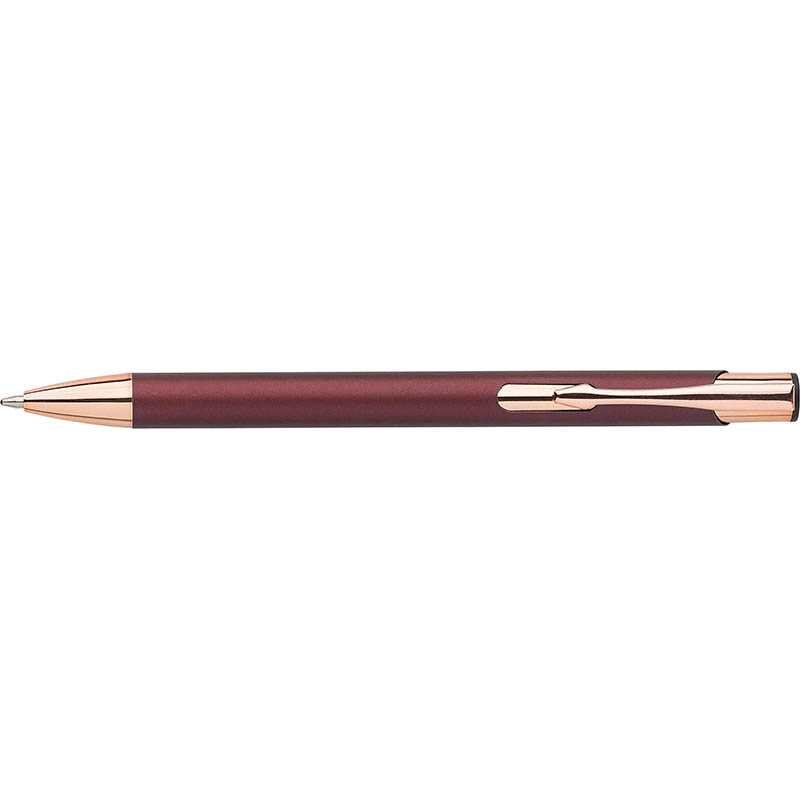 Aluminium ballpen with matte finish and rose gold details. Blue ink. When engraved the design will be silver colored.