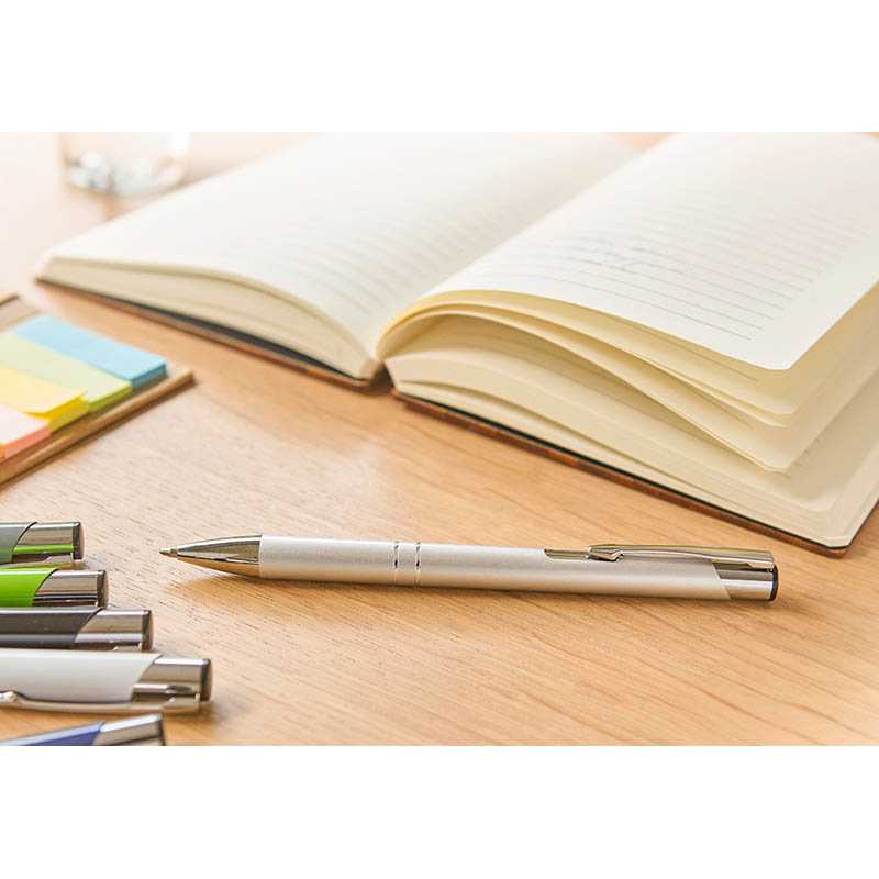 Hliníkové guľôčkové pero s farebným telom, čiernou špičkou a klipom. S modrou náplňou.