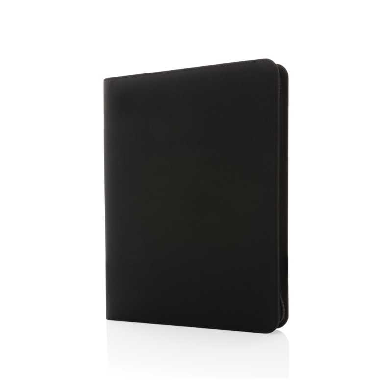 Prémiové portfólio na zips vo formáte A4 s obalom z 300D polyesteru. Vnútri obsahuje vrecko na telefón, stojanček na telefón, 2 sloty na vizitky alebo karty a vymeniteľný poznámkový blok z recyklovaného linajkového papiera (20 strán, 64g/m2). Vyrobené z recyklovaného polyesteru vrátane skenovateľnej zložky AWARE™ garantujúcej obsah recyklátu. Na výrobu bolo využité 8 500ml PET fliaš. Z výťažku každého predaného produktu z kolekcie Impact prispievame 2% na podporu iniciatívy Water.org. Bez PVC.