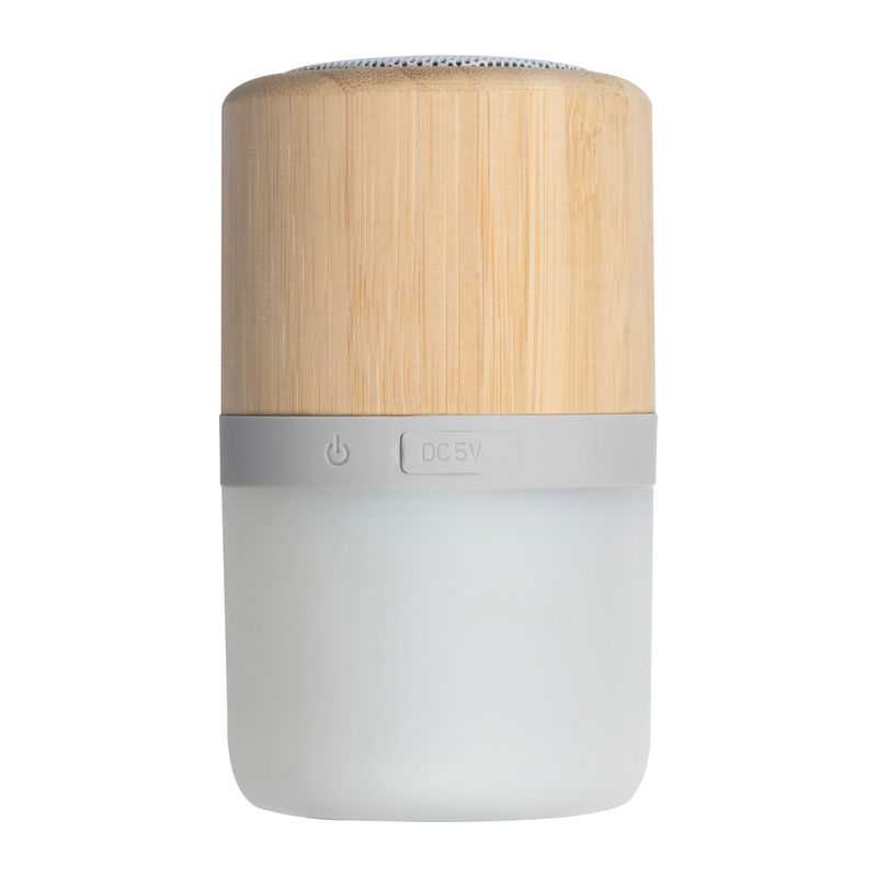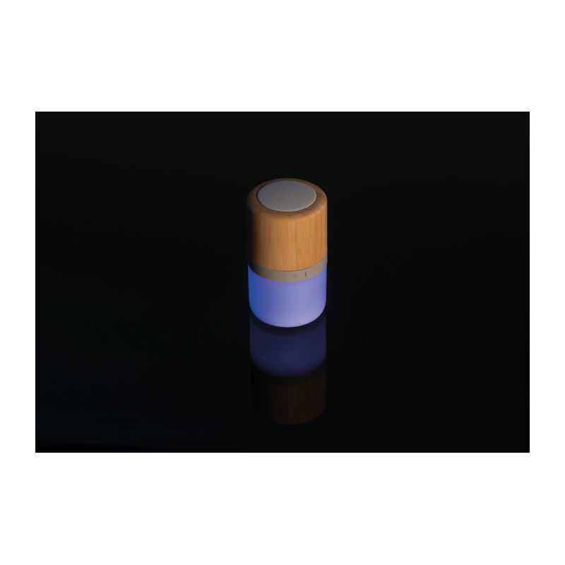 Bluetooth reproduktor v puzdre z recyklovaného ABS plastu a bambusu s viacfarebným LED svetlom na spodnej strane. S popruhom a vstavanou dobíjacou batériou. Vrátane USB nabíjacieho kábla.