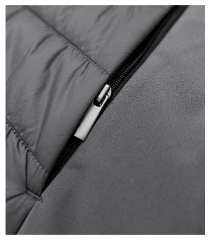 kombinácia prešívaného a softshellového materiálu, strih tvarovaný bočnými dielmi, celozapínací špirálový zips s krytkou brady, bočné vrecká so špirálovým zipsom, vnútorné náprsné vrecko na zips, tvarovaný a mierne predĺžený zadný diel, vstup pre branding