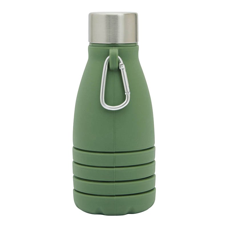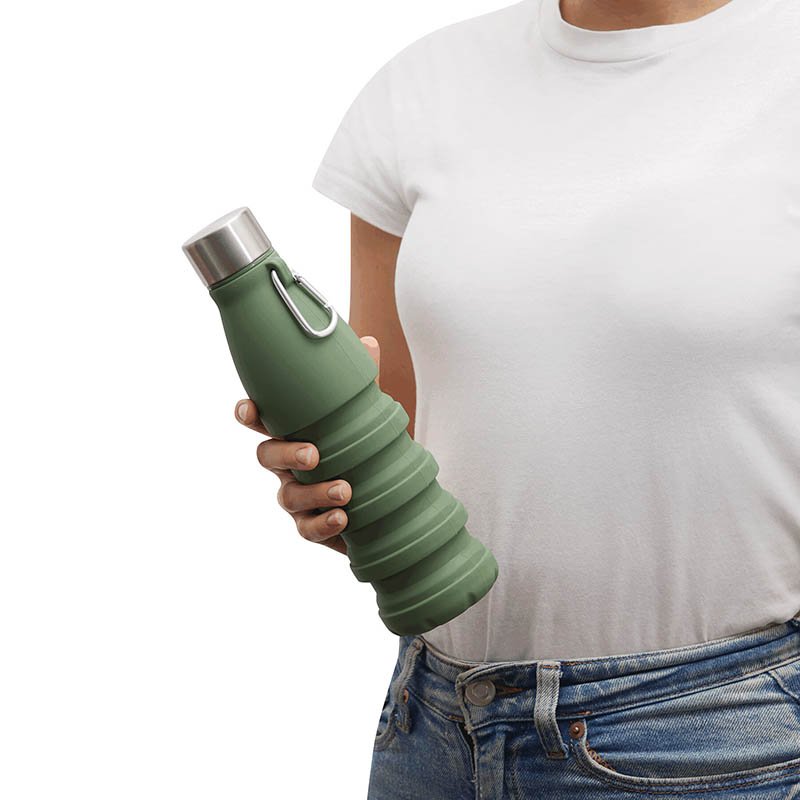 NOVINKA 2025. Foldable drinking bottle BIG GETS SMALL: stainless steel lid with secure screw cap and silicone sealing ring, with aluminium carabiner (the carabiner is NOT suited for climbing), the bottle can be extended and folded by approx. 8 cm, capacit