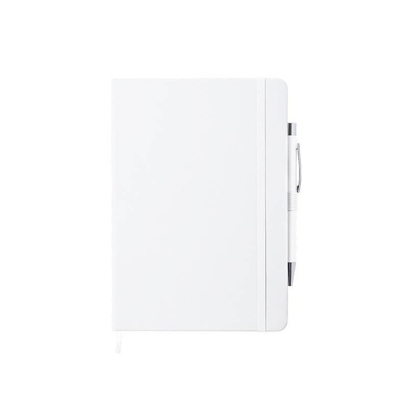 NOVINKA 2025. Notepad and ball pen set in matching color. Hard covers notebook with soft touch PU leather finish, including pen holder, bookmark and elastic band, with 100 inner lined sheets. Also including an aluminium ball pen in rubberised finish with jumbo cartridge. Available in a wide range of colours.