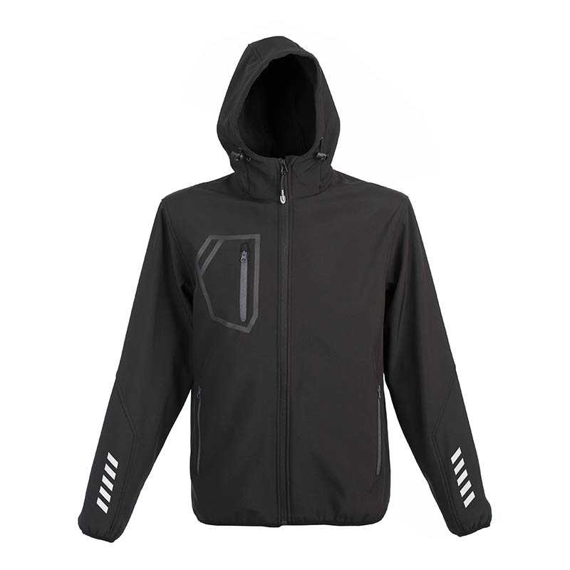 "Softshell jacket two layers water resistance - 96% polyester – 4% elastan - Waterproof 6000 mm/H2O - Reflective printing on arms and shoulders - Hood with coulisse - One chest pocket with zip - Two pockets with zip - Elasticized fabric on cuffs - Elastici"
