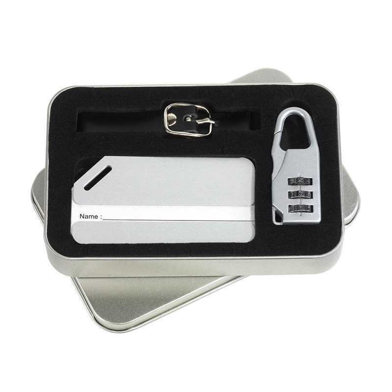 Luggage tag set FAR AWAY consists of aluminium tag with removable address field, strap with buckle to attach to luggage, and combination lock with snap hook, in metal box