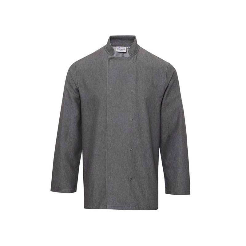 Liquid repellent fabric with antibacterial treatment Asymmetrical front closure with hidden automatic buttons Neckband collar Back fashioned with Coolmax breathable fabric, one-piece Ta