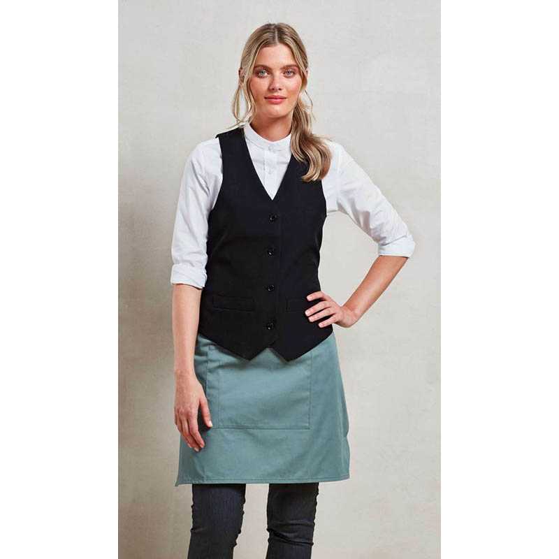 Two ties at ends to fasten garment Metal buckle to adjust neckband Two pockets: 1 front pocket with pen compartment 1 coin pocket