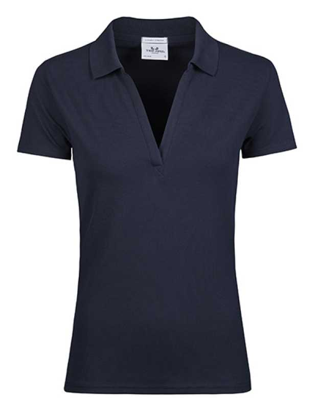 Ladies' polo pique in stretch quality made of organic Fairtrade cotton with elements of elastan for a better fit. Shaped v-neckline, ribbed collar and cuff, straight sleeve and stitch