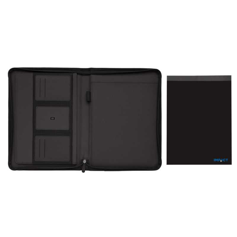 Skutočne transparentná ekológia. Kolekcia Impact obsahuje vystopovatelnou zložku AWARE™, ktorá využíva moderné možnosti skenovania a technológiu blockchain, vďaka čomu je možné s istotou garantovať recyklovaný pôvod použitého materiálu a reálnu úsporu vody.Na výrobu tohto produkta bolo využité 10 PET fliaš a bolo ušetrených 6 litrov vody. Z výťažku každého predaného produktu z kolekcie Impact prispevame 2% na podporu iniciatívy Water.org. Unikátne portfólio so zipsom vo formáte A4 vyrobené z rPET AWARE™. Vo vnútri obsahuje 1 veľkú kapsu, vrecko na telefón, 2 dodatočné menšie vrecká, 4 sloty na karty a pútko na pero. Vrátane zápisníku s 20 listami/40 stranami recyklovaného krémového linajkového papiera o gramáži 80g/m2. Vonkajšia tkanina a vnútorná podšívka je vyrobená zo 100% polyesteru AWARE™ získaného z recyklovaných PET fliaš. Bez PVC. Kalkulácia úspor vychádza z overených LCA dát zverejnenými globálnou neziskovou organizáciou Textile Exchange.