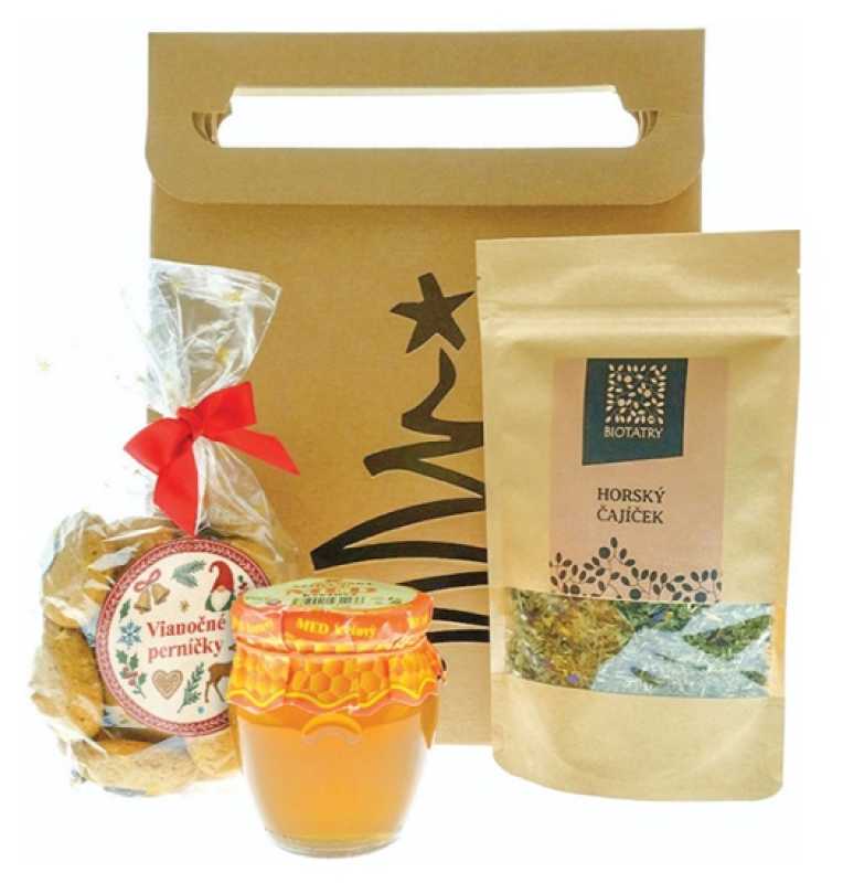 Darčeková sada obsahuje : Kvetový med 250g amfora; Vianočné perníky zdobené (orech, brusnica) > 250g; Horský čajíček > 30g; Darčeková taška