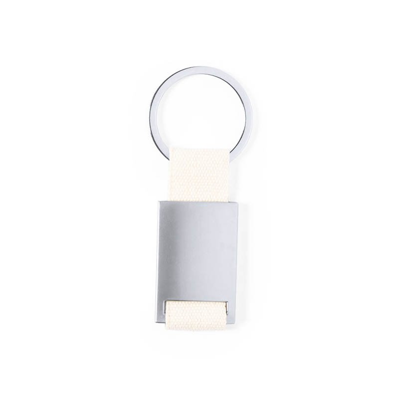 NOVINKA 2025. Keyring with silver finish metal body. cotton ribbon with natural finish, with wide branding surface and matching metal ring. Presented in an individual bag with kraft cardboard insert.