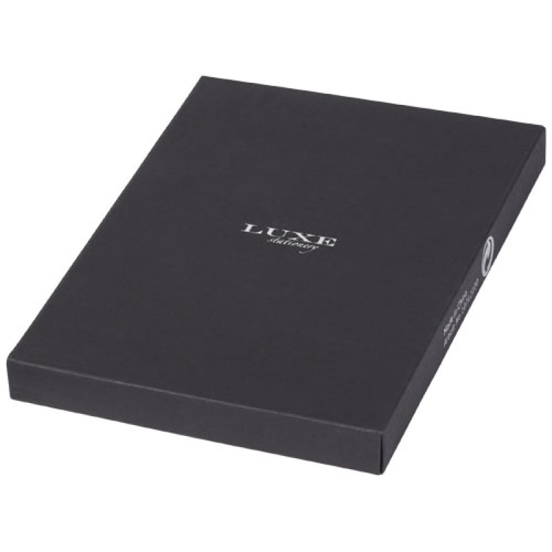 Exkluzivní designový zápisník (velikost A5) s gramáží 80 g/m2, 80 listů krémového papíru s vnitřní zadní kapsou a smyčkou na pero. Zabaleno v dárkové krabičce "LUXE".