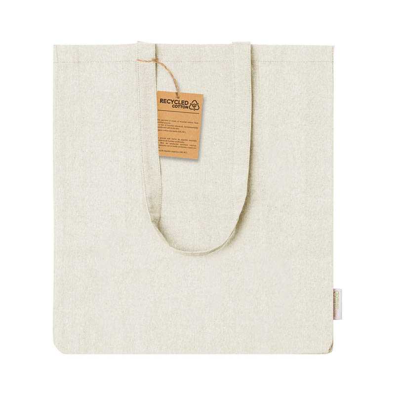 Nákupná taška z recyklovanej bavlny s klinom, dlhými ušami a výrazným štítkom z recyklovanej bavlny. 100% recyklovaná bavlna, 140 g/m2.