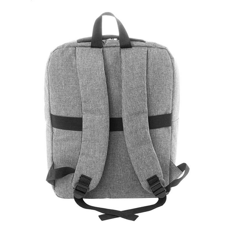 Polyester (600D) backpack with zipper main compartment and front pocket. With USB exit on the side. Adjustable padded shoulder straps.