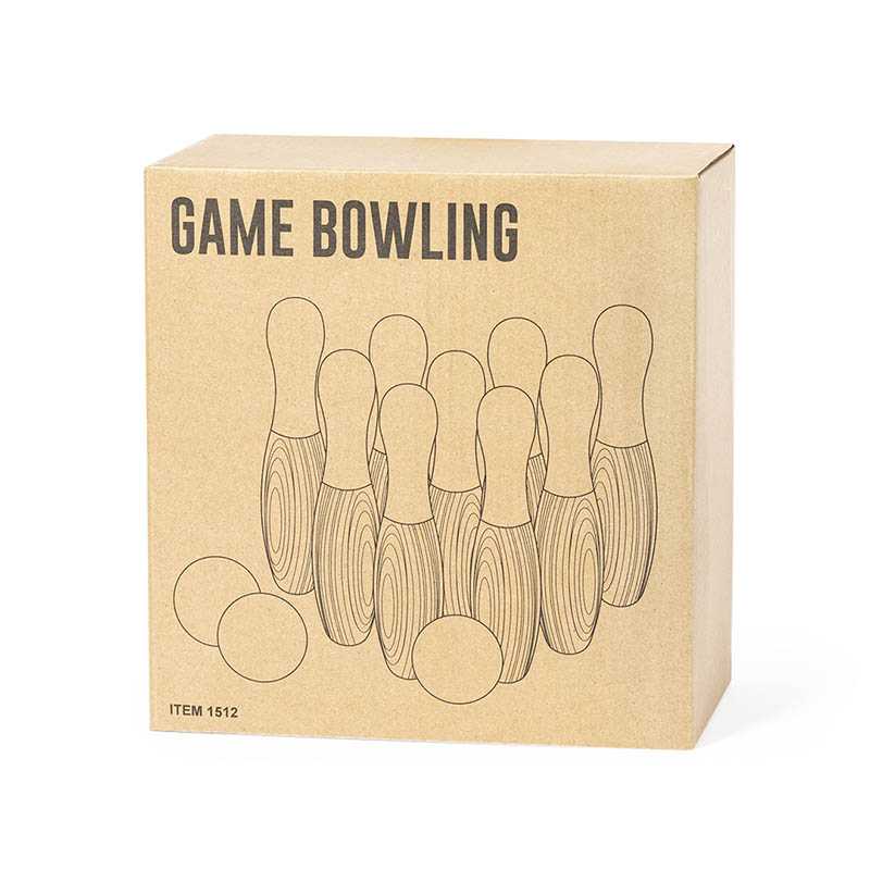 NOVINKA 2025. Bowling set made of resistant natural pine wood, each skittle top lacquered in white. Set of 9 skittles and 3 white balls, in a cotton carry bag with matching drawstring. Presented in an individual box in kraft design, with instruction manual in English and Spanish.