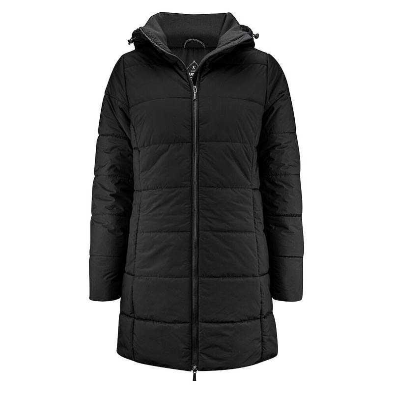 NOVINKA 2024. Longer padded jacket with two-way zipper. Detachable hood, which is adjustable with elastic cords. Ribbed collar and rib ending at the sleeves. Two side pockets with zippers. One chestpocket on the inside with zipper. Soft knitted fabric on the inside of the side pockets. Colors: 600 navy, 900 black Outerfabric: 100% Recycled Polyester, 67 g/m2 (GRS) Padding: 100% Recycled Polyester Repreve Padding (Bluesign), 160 g/m2 in body, 140 g/m2 in sleeves Lining: 100% Recycled Polyester, 35 g/m2 (GRS) XS-XXL