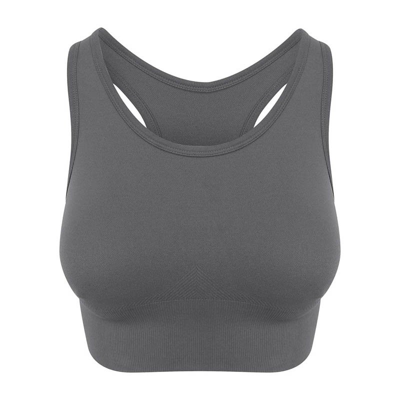92% Nylon 8% elastane. Seamless construction for ease of movement and comfort. Racer back design. Scoop neckline. Pull on style. Wide under band for secure fit and long line. Self-fabric binding around neckline and armholes for a clean finish. Simple tear off label makes it perfect for rebranding. Padded cups for support.