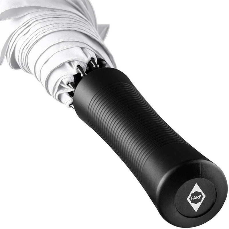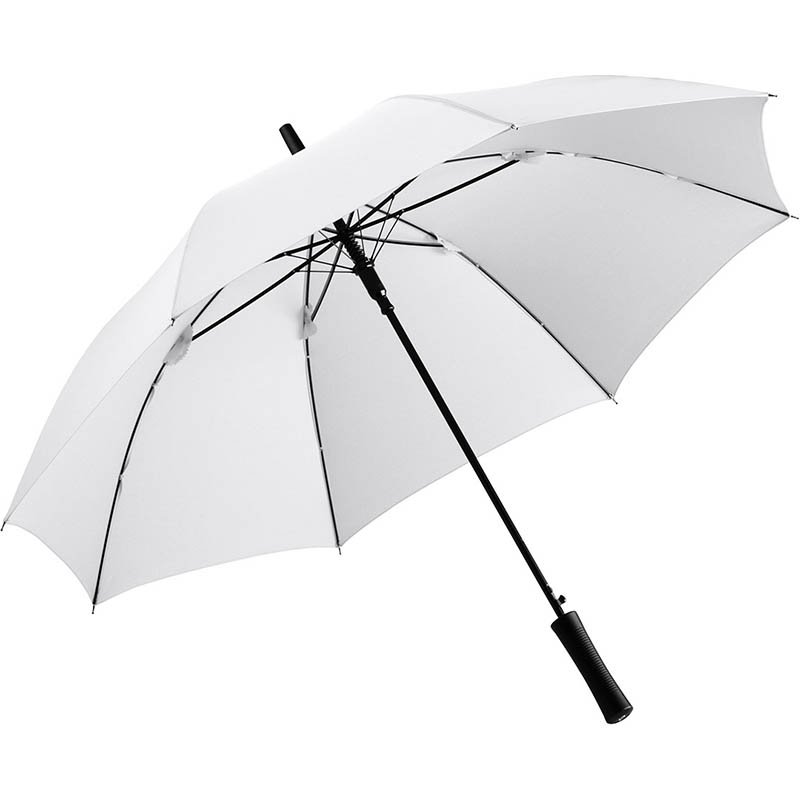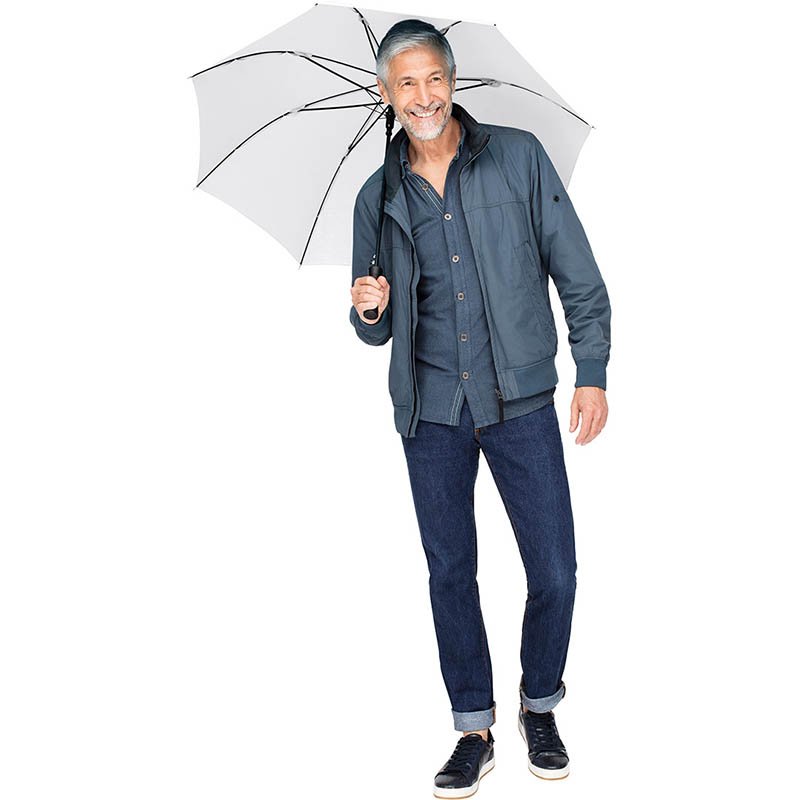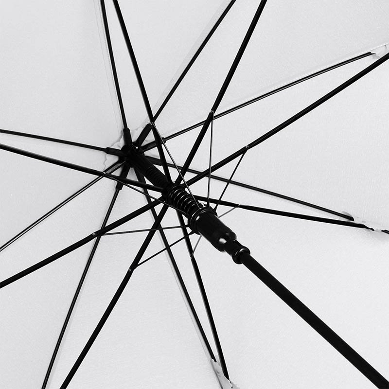 Convenient automatic function for quick opening, Windproof system for higher flexibility and stability in windy conditions, flexible fibreglass ribs, straight dull black plastic handle with promotional labelling option, higher corrosion protection due to galvanized steel shaft